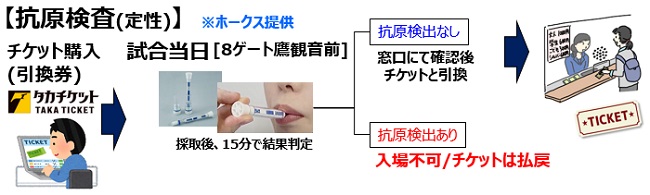 試合当日、14:00~19:00の間に8ゲート鷹観音前で無料の「抗原検査(定性)」を受けていただき、結果が「抗原検出なし」であればご観戦いただけます。