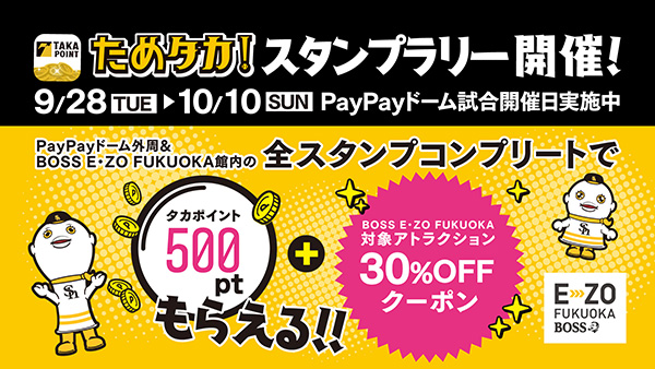 9月28日(火)~10月10日(日)のうち、PayPayドームで試合が開催される7日間限定で、「タカポイント500pt」とBOSS E・ZO FUKUOKAの「アトラクションチケット30%OFFクーポンコード」が獲得できるためタカ!アプリのスタンプリーを開催します!