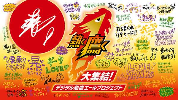 今年の終盤戦は「熱く鷹く!」のスローガンのもと、9月20日(月・祝)よりオンライン上やBOSS E・ZO FUKUOKAでファンの皆さまから”熱い”メッセージを集める「大集結!デジタル熱鷹エールプロジェクト」を開始します。入場制限や自粛生活が続く今だからこそ、球場にお越しの方はもちろん、どこからでも、全員の想いをメッセージに乗せてチームや選手へ届けましょう。