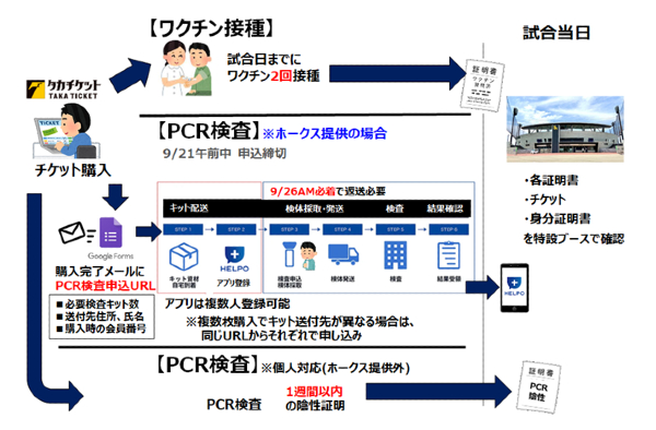 お子様など、ワクチン接種2回を完了できない方につきましては、PCR検査を受けていただき、観戦日1週間以内のPCR検査結果が陰性の証明書等をご用意ください。ホークスでもPCR検査(無料)を提供しています。ご希望の方は下記をご確認ください。
