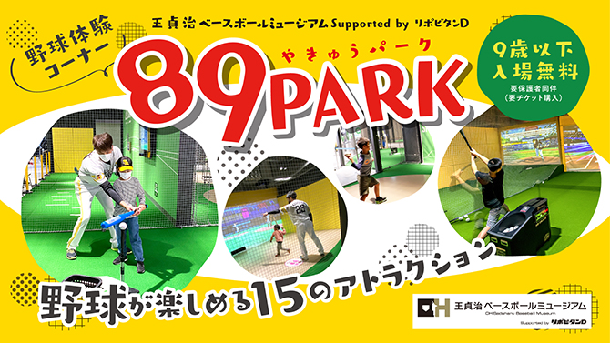 王貞治ベースボールミュージアム Supported by リポビタンD内の89パークだけ遊びたい!という声にお応えして、89パークのみ体験できるお得な入場チケットをご用意しました!バッティングやピッチング体験はもちろん、プロ野球選手の投球スピードを見たり、ホークス選手と走ってスピードを競えたり、ご家族や友人と思いっきり楽しく体を動かせますよ♪