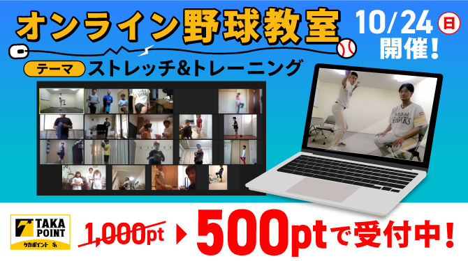 10月24日(日)開催のホークスOBが講師を務める「オンライン野球教室」の参加者を、タカポイント交換にて先着順で募集します。