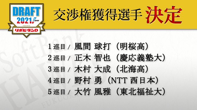 10月11日(月)、「2021年 プロ野球ドラフト会議 supported by リポビタンD」が東京都内で行われました。ホークスはまず風間球打投手(ノースアジア大学明桜高校)を入札し、1位指名で交渉権を獲得しました。