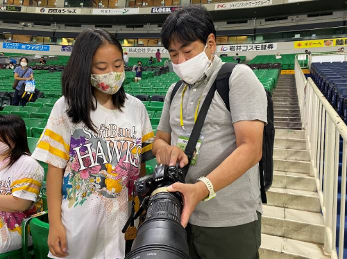 大きなレンズの立派なカメラを携えておじいちゃんと一緒に球場に現れた李音さん。まずは良い写真を撮るための心構えや技を学びます。この日、李音さんのチャレンジをサポートしてくれるのは西日本新聞社の永田浩カメラマン。