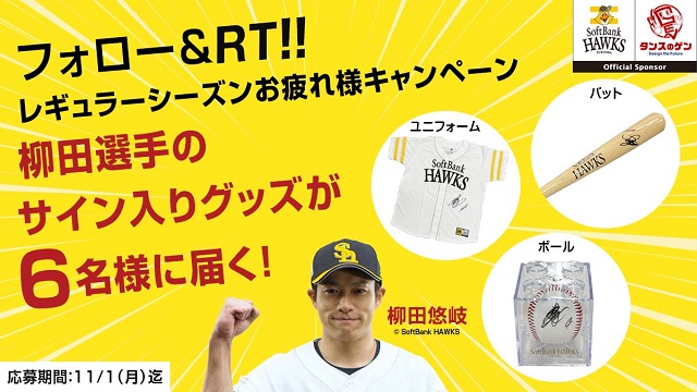 タンスのゲンの公式Twitter@tansu_no_genにて、レギュラーシーズンお疲れ様キャンペーンを開催します。ご応募いただいた方の中から抽選で6名様に柳田選手の直筆サイン入りグッズが当たる!(グッズはユニフォーム・バット・ボールの中からランダムとなります。)フォロー&リツイートで簡単にご応募いただけます。11月1日(月)まで応募受付していますのでホークスファンの皆様奮ってご応募ください!