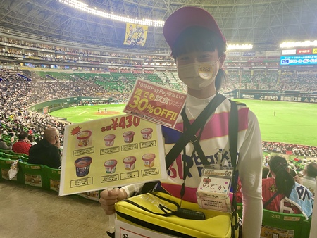 和花さんのサポートをしてくれるのはサーティワンアイスクリーム売り子の「みこ」さん。「多い時には1試合でドームを10周くらい歩くこともあるんだよ~」と普段の仕事のお話も聞きながら、先輩にお客さんへの声のかけ方や、精算の操作を教わり、いざスタンドへ。