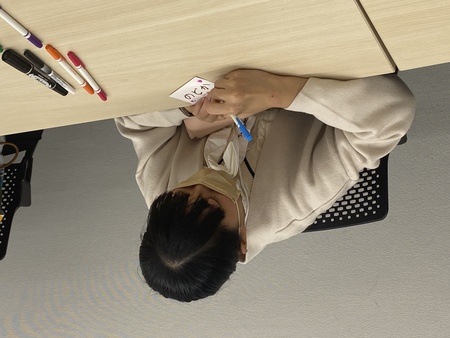 球場に到着すると、まずは自分の名札作りからスタート!色を付けたり、イラストを描いたり少しでも目立つように一工夫。もうすぐハロウィンということで、カボチャの絵を描いたかわいい名札が完成!これで売り子になる準備ができました。