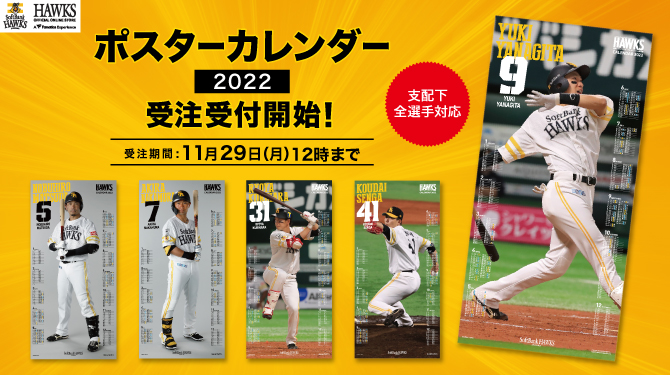 支配下全選手から選べる「ポスターカレンダー2022」が今年も登場!本日より、HAWKS STORE PayPayドーム店とHAWKS公式オンラインストアで受注販売を開始します。
