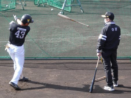 興味深かったのはロングティーとフリー打撃を見守った直後です。王会長自ら井上選手をネットの前に連れていくと、身振り手振りを交えて指導。井上選手はネットの方を向いて素振りを行い、スイングした際にバットを投手方向に放り投げるという練習法を伝授されていました。