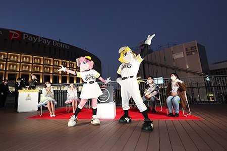 点灯式には人気アイドルグループ「HKT48」の田中美久さんと渕上舞さん、クラブホークス会員の中から「名前が光っている人」を募集し応募で選ばれた「ひかり」さん「勇輝」さん「明美」さん、球団マスコットの「ハリーホーク」&「ハニーホーク」、球団の吉武隆取締役が出席。そして「体操兄さんトッシー」がイベントMCを務めました。