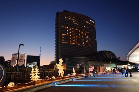 PayPayドームやBOSS E・ZO FUKUOKA、さらに周辺施設も一帯となり幻想的な光の世界を演出。この日は「ヒルトン福岡シーホーク」の壁面に「2021Sh」の文字が浮かび上がりました。