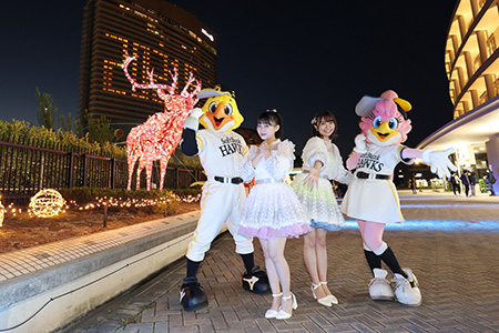 HKT48の田中美久さんは「キラキラ輝いていてとてもきれいです」と笑顔。同じくHKT48の渕上舞さんは「来年のプロ野球の開幕まで時間があって寂しい気持ちかもしれませんけど、百道エリアへ心温まる思い出を作りに来てほしいです」と呼びかけました。
