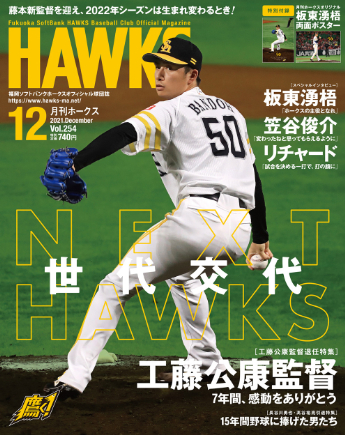 12月号のテーマは「世代交代」。長谷川勇也選手、髙谷裕亮選手の引退もあり、今ホークスは世代交代の時期にきています。2022年シーズンは、若鷹の台頭が急務。来季注目の若鷹に迫ります。