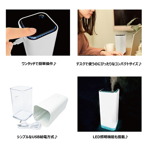 | 商品説明 | 1回の給水で最大8時間の連続運転が可能なコンパクト卓上加湿器です。1ボタンによる簡単操作、大口容器による簡単給水が特長で、デスク上やベッドサイドなどで日常的にお使いいただけるような商品となっております。また、超音波方式の加湿器ですので消費電力も少なく、加熱もしませんので安心してお使いいただけます。 |