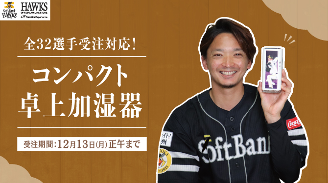 全32選手受注対応!オフィスや在宅ワーク中のデスクに置くのにぴったりな卓上サイズの加湿器を受注販売します。また、選手がキャラクターに扮したビジュアルが話題のキングダムグッズに、時計が新登場!「工藤監督ありがとうグッズ」では、九州三大美林の一つ日田杉で制作された額縁付時計がラインナップに加わりました。