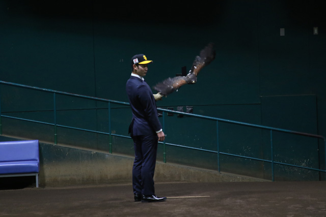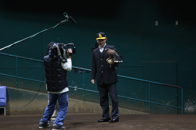 まず風間投手がマウンドへ立ち、打席の正木選手へ鷹を投げ放ちました。大きく羽を広げた鷹は、美しい軌道を描いて見事に正木選手のもとへ着地成功。最初は恐る恐る鷹と接していた2人の選手からも笑みがこぼれていました。風間投手も「思っていたより楽しかった」とニコニコ顔でした。