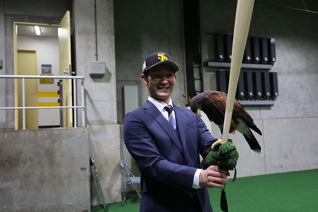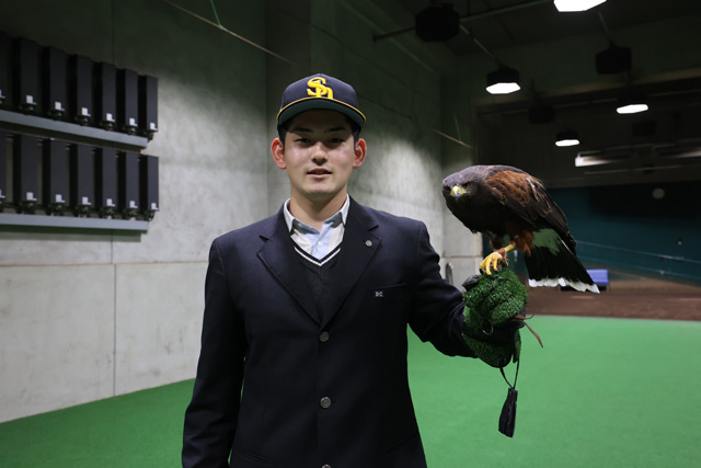 12月10日(金)、PayPayドーム三塁側ブルペンにやって来た両選手を待っていたのは、ホークスにちなんだ本物の「鷹」(ハリスホーク・麗くん)でした。