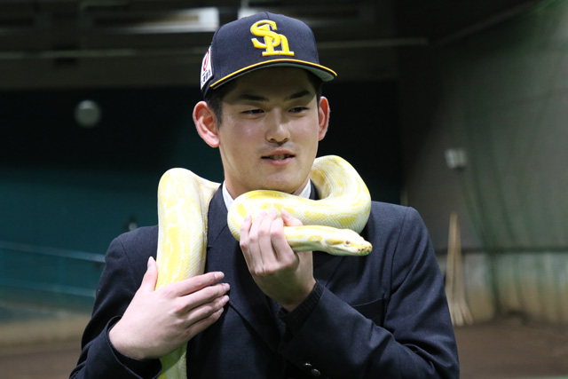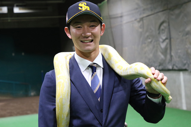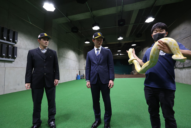 ホークスに新入団する来季のルーキー、風間球打投手と正木智也選手の2人が「ホークスからの初仕事」として動物ふれあい体験を行いました。