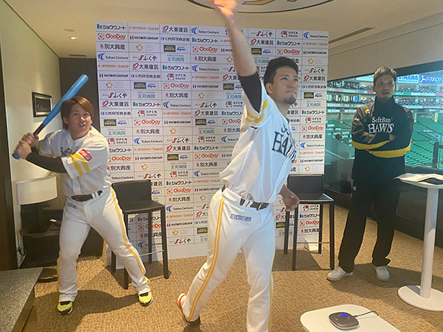 講師は2人1組に分かれ、板東湧梧投手とリチャード選手、森唯斗投手と栗原陵矢選手、東浜巨投手と中村晃選手、千賀滉大投手と甲斐拓也選手、笠谷俊介投手と今宮健太選手、嘉弥真新也投手と周東佑京選手のコンビで指導にあたりました。
