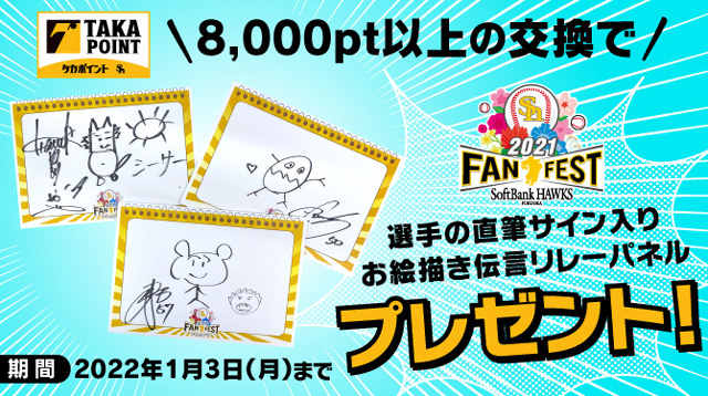 タカポイントでは、ファンフェスティバル2021の『お絵描き伝言リレー』で生まれた”迷作”が当たるキャンペーンを実施します。12月24日(金)~2022年1月3日(月)の期間中に8,000pt以上交換&エントリーされた方の中から抽選で19名様に、イベント時に選手が実際に描いた直筆サイン入りイラストのパネルをプレゼント!