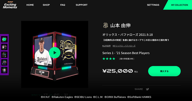 初期ラインナップ「Series 1 - ’21 Season Best Players」は、2021シーズンで特に活躍した選手を中心に計18プレーを収録予定です。シーンや選手に応じて、★の個数でレアリティが付いており、専用ウェブサイトで簡単に購入、お楽しみいただけます。通常の試合の公式映像は、ダウンロード等は禁止されていますが、購入いただいたコンテンツは、ダウンロードしてお客さまご自身で保有したり、サービス内機能を活用時のみSNS等でシェアいただくことも可能です。