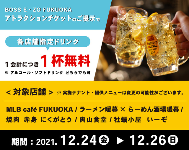 ご利用当日のBOSS E・ZO FUKUOKA内アトラクション・劇場チケットを持参で、BOSS E・ZO FUKUOKA内各飲食店舗の指定ドリンク一杯無料
