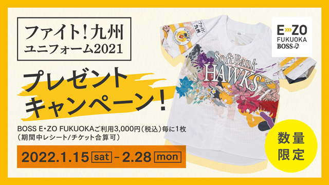 | 詳細 | BOSS E・ZO FUKUOKA内各店舗を税込3,000円毎、ご利用の方に「ファイト!九州ユニフォーム2021(レプリカ)」を1枚プレゼントします。 ※期間中のレシートまたは入場チケットは合算可能 |