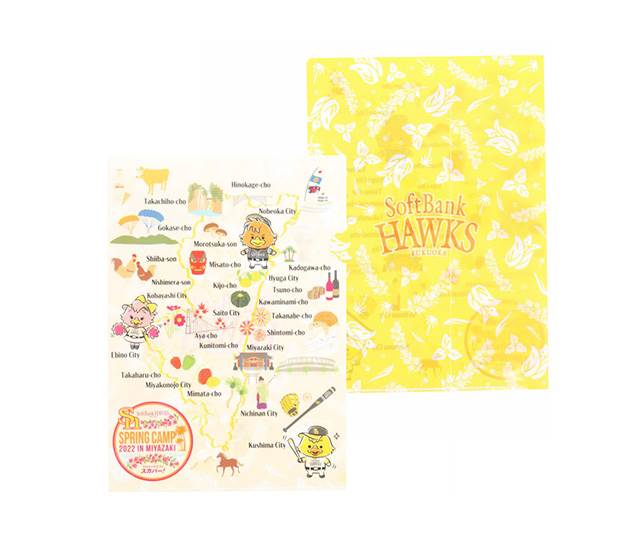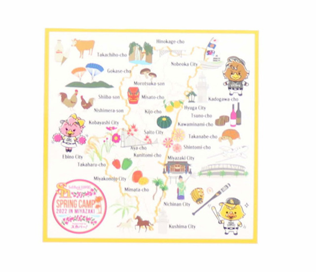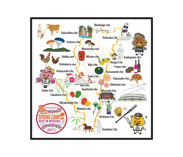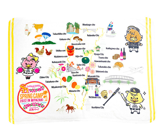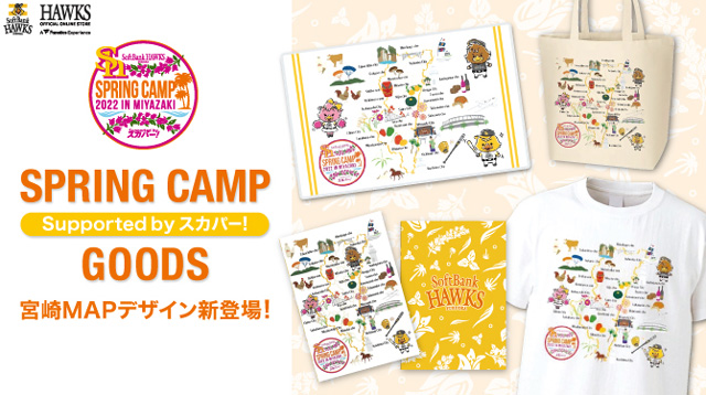 ホークス春季キャンプ in 宮崎 Supported by スカパー!限定の「宮崎MAPデザイン」グッズが新登場!宮崎の名所や名産品を地図にしたデザインは、キャンプ観戦と宮崎巡りを一緒に楽しめ、記念品にもぴったり!その他にも、宮崎ならではのマンゴーを使ったお菓子や人気の若鷹ガチャのキャンプver.は2月1日(火)から販売開始です。気になるアイテムをチェックしてキャンプを応援しよう!