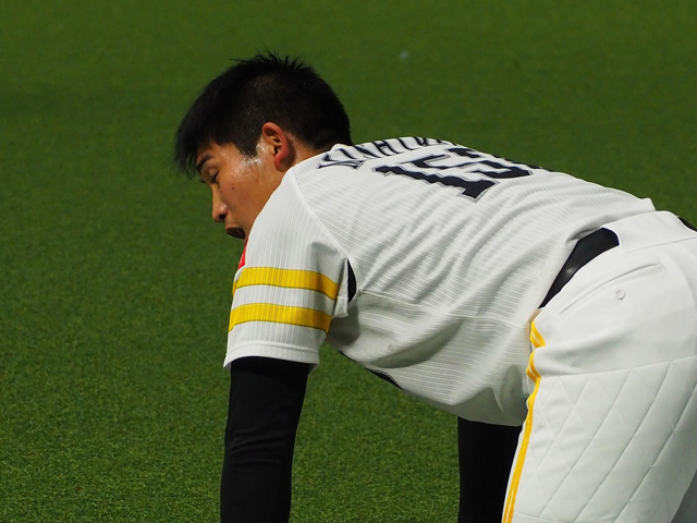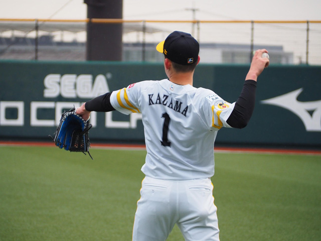 ドラフト1位ルーキーの風間球打投手。期待を込めて託された背番号1がガッチリした身体によく似合っていました。