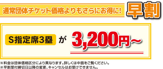 早めにお申込みいただくだけで、通常団体チケット価格よりもさらにお得に!