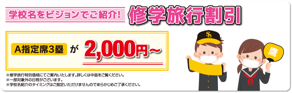 修学旅行の団体様は、特別価格にてご案内いたします。さらに「学校名」をPayPayドームのビジョンでご紹介!