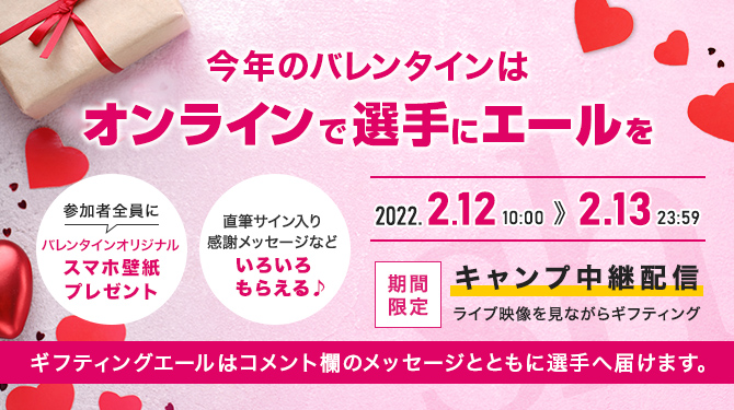 今年のバレンタインはオンラインで選手にエールを送ろう!バレンタイン直前の2月12日(土)~13日(日)の期間、オンラインでエールを送れるギフティング機能を使ったイベント開催。皆さんからいただいたエールはバレンタインデーに選手の部屋まで確実にお届け!さらに、ご参加いただいた方には感謝の気持ちのお返しも。期間中は限定でキャンプ中継も見られます。キャンプ中継を見ながら応援する選手にエールを送ろう!