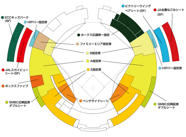 | 席種 | S指定席、A指定席、B指定席、外野指定席、 ホークス応援席-指定のいずれか |