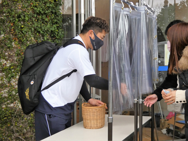 また、バレンタインデーが近かったこの日、キャンプ中恒例となっている「選手から逆チョコ」企画が、今回は新型コロナウイルス感染対策を講じた上で実施されました。柳田悠岐選手や森唯斗投手、甲斐野央投手、上林誠知選手をはじめハリーとハニー、ハニーズらがファンの皆様へチョコをプレゼントしていました。