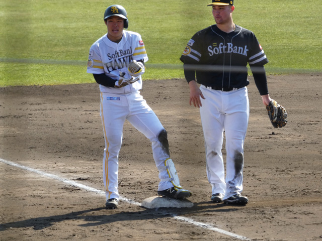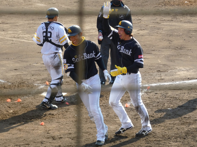 初回から点を取り合った。紅組は紅白戦初出場した柳田悠岐選手が、東浜巨投手から左前適時打を運んで先制した。白組はすかさず猛反撃。中村晃選手、今宮健太選手、井上朋也選手の中軸が3連続適時打を放って逆転した。