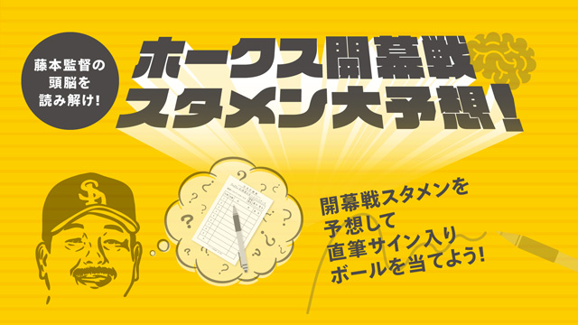 応募フォームより各ポジション1名ずつ選手を選択し、必要事項を入力のうえご応募ください。藤本監督の頭脳を読み解き、見事スタメン選手9名全員が的中された方の中から抽選で、開幕スタメン選手(いずれか1名)直筆サイン入りボールをプレゼントします。