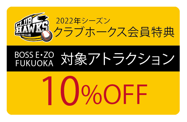 2022シーズンより、クラブホークス会員の方はBOSS E・ZO FUKUOKA対象アトラクションを10%OFFでご利用いただけます。