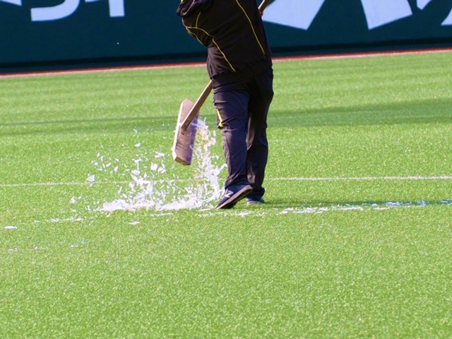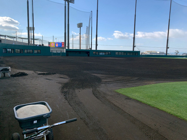 週末の雨や雪による冷え込みが影響したようで、タマスタに敷いていたシートの上に今朝、氷が張っていたそうです。芝の上にも氷がしっかり残っていたので、グラウンドキーパーさん達が朝から整備に努めていらっしゃいました。