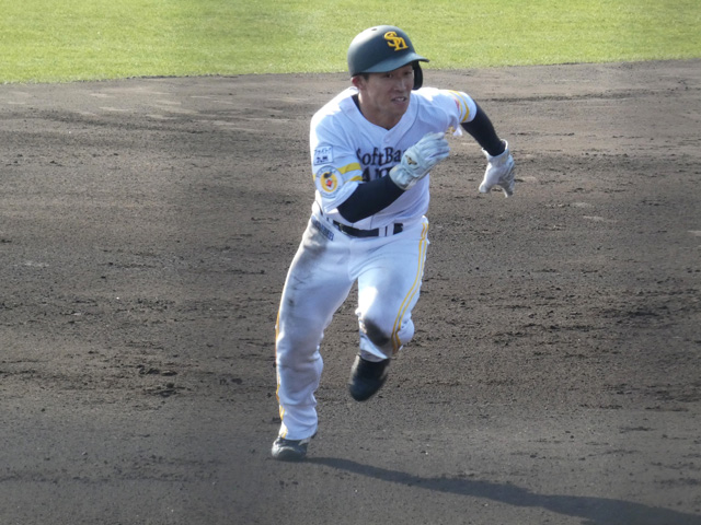 どの選手も、とにかく出塁すれば積極的に走りました。八回の攻撃では1アウト一、三塁で一走・高田知季選手が牽制球で誘い出された中で、三走・三森大貴選手が隙をついて本塁に生還する重盗を成功。また、ルーキーの野村勇選手は六回に代走起用されると二盗、三盗を披露しました。藤本監督によれば「(チームトップクラスの)佐藤(直樹選手)より速い」と言い、さらに「本多コーチが言うには周東よりもタイムがいい」とも明かしており、新たなスピードスターの誕生も予感させます。野村勇選手も「足には自信があります。小さな頃は速くなかったけど、高校生くらいになって筋力がついたおかげか速くなりました」と嬉しそうでした。