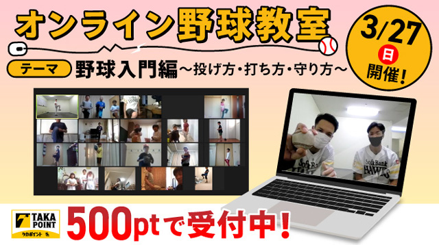 3月27日(日)開催のホークスOBが講師を務める「オンライン野球教室」の参加者を、タカポイント交換にて先着順で募集します。