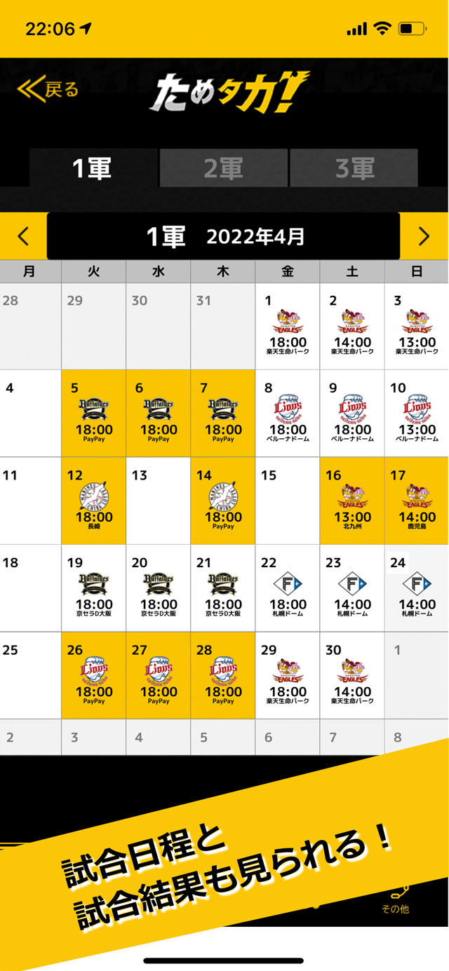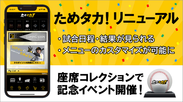 ホークス公式アプリの「ためタカ!」がリニューアル!デザインを一新し、1軍から3軍の試合日程を見る新機能が追加されるほか、お客様一人ひとりの好みに合わせてメニューをカスタマイズできるようになりました。