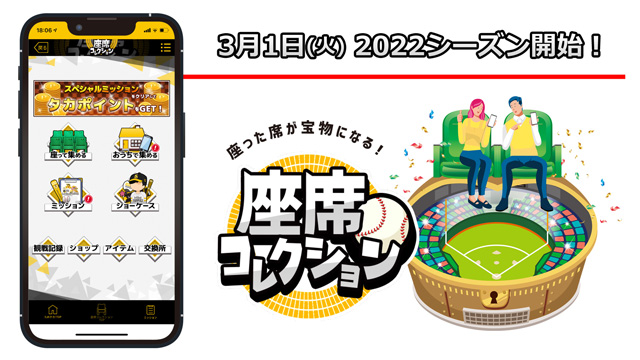 また「ためタカ!」アプリ内の「座席コレクション」は、3月1日より、ためタカ!リニューアルと新シーズンのスタートを記念したログインボーナスイベントを開催!新席種ももちろん対象となり、機能も追加されました。今シーズンも、ためタカ!を使ってホークスを応援しよう!