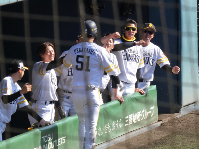 先発した千賀滉大投手と2番手・和田毅投手が3回4失点と悔しいマウンドになったが、打線はじわじわと反撃した。六回、井上朋也選手の二塁打の直後に上林誠知選手が「完璧」と振り返るライトスタンドへの1号2ランで、まず2点を返した。井上選手は続く打席でも二塁打を放ち3打数2安打とアピールした。
