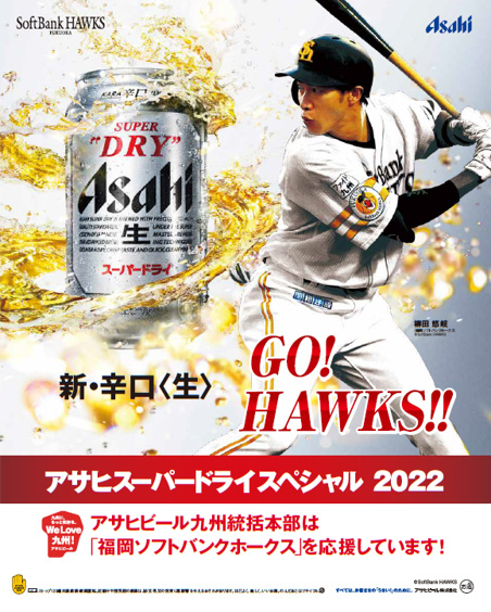 アサヒビール九州統括本部では、「アサヒスーパードライスペシャル2022」のPRに、福岡ソフトバンクホークス所属の柳田悠岐選手を起用します。柳田選手は、アサヒビールが協賛する公式戦「アサヒスーパードライスペシャル2022」当日のポスター、動画での広告やスクラッチチャレンジ告知広告など各種プロモーションで登場します。
