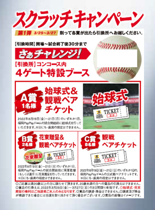 開幕3連戦限定で、PayPayドームにてアサヒビールの生ビールを購入していただいたお客様にスクラッチカードを進呈。 スクラッチカードを削って当たると、豪華賞品が当たるキャンペーンを実施致します。