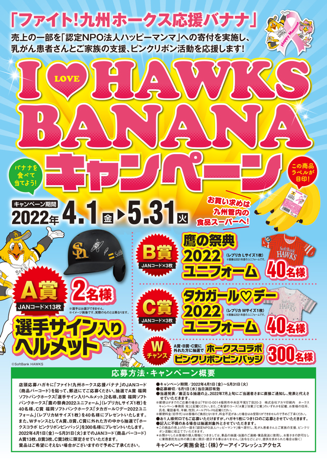 このバナナはホークスの地元、九州をもっと元気にしたいとの思いで九州全県のスーパー等各所で発売が開始されており、売上金の一部が「認定NPO法人ハッピーマンマ」に寄付され、「乳がん早期発見のための啓発」や「乳がん患者様と御家族のケアおよびサポートの充実」に役立てられます。