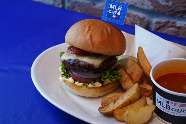 パブリックビューイング限定で、エンゼルスの赤にちなんだオリジナルメニューを提供します!ピリッと辛いサルサバーガーを食べて熱く盛り上がりましょう!