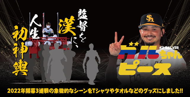 第一弾は、開幕セレモニーで和太鼓演奏のなか神輿に乗って登場し、選手やファンに衝撃と爆笑を与えた藤本監督と、起死回生の逆転満塁ホームランで開幕戦を勝利に導いたガルビス選手の“ガルちゃんピース”!HAWKS公式オンラインストアでの受注販売のみとなりますので、この機会をお見逃しなく!