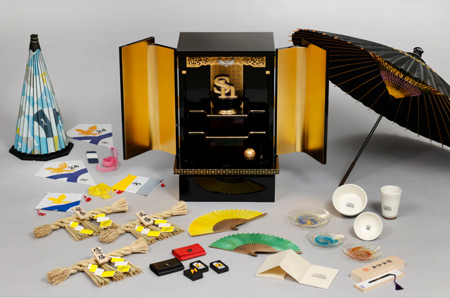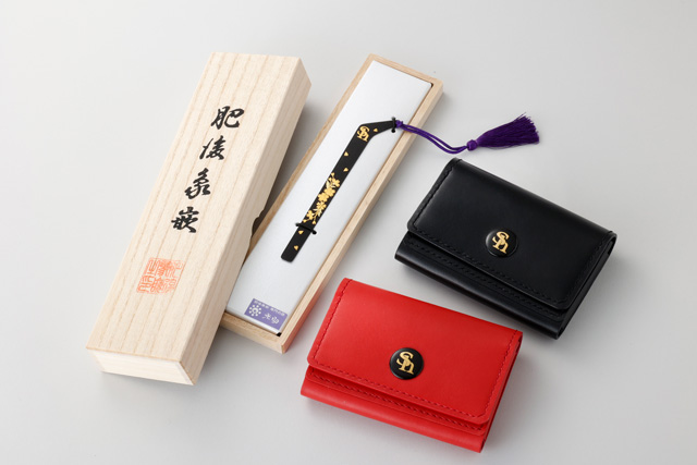 熊本県の伝統的工芸品・肥後象嵌からは、ホークスロゴである「sh」が純金細工された名刺入れと、しおりがラインナップ。本革の名刺入れの中にはアンバサダー今宮選手の名刺が一枚セットされています!しおりはさくら柄の純金細工が美しく、桐箱に入った貴重な一品です。