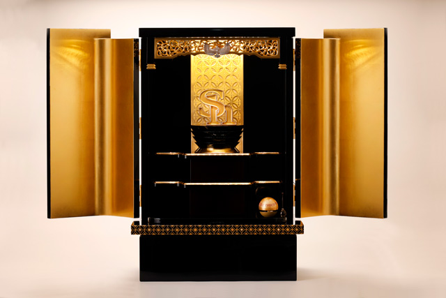 福岡県の伝統的工芸品・八女福島仏壇ブランドのお仏壇。ご神体には金色に輝く「sh」のロゴを飾れて、かっこいい「鷹」のシルバーのお飾りや、かわいい野球ボールデザインのお鈴も付いています。